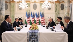 Лидеры торжественно открыли здание дипломатической миссии Узбекистана, разрезав символическую ленту. Прозвучали государственные гимны двух стран.