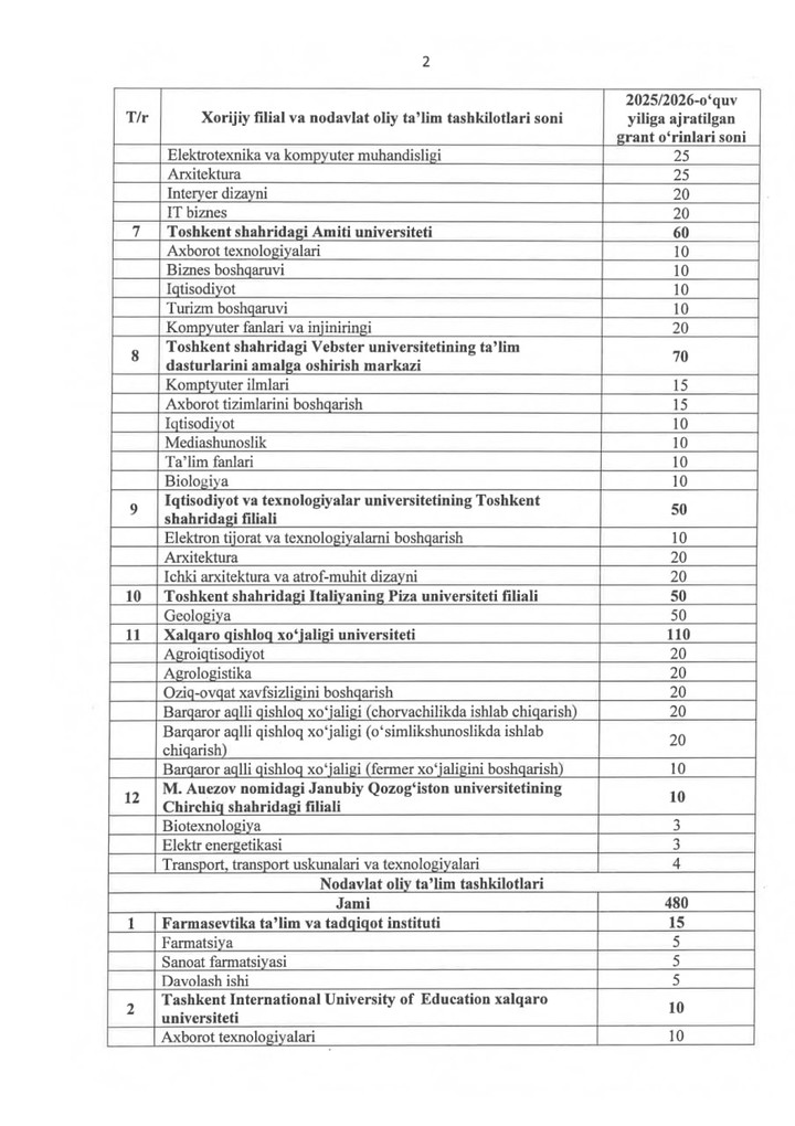 Xorijiy va nodavlat OTMlarga ajratilgan 1 320 ta davlat granti bo‘yicha ro‘yxatdan o‘tish boshlandi