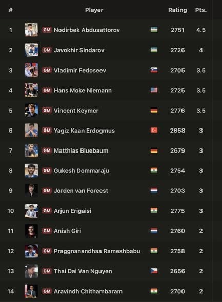 Мусобақанинг Masters гуруҳида кеча 6-тур баҳслари ўтказилди. Унда Ўзбекистоннинг биринчи рақамли шахматчиси, 21 ёшли гроссмейстер Нодирбек Абдусатторов амалдаги жаҳон чемпиони, ҳиндистонлик Гукеш Домараджуга қарши оқ доналарда баҳс олиб борди. Испанча партиянинг 35-юришигача ўйин мутлақо тенг кечди. Бироқ 36-юришда Гукеш томонидан йўл қўйилган қўпол хато рақибга қимматга тушди — Абдусатторов вазиятдан усталик билан фойдаланиб, рақибини таслим бўлишга мажбур қилди.