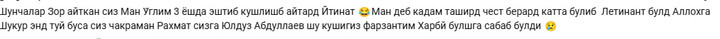 Izohlar orasida bir onaxonning yozganlariga ko‘zim tushadi, shoshgancha izohni keyin yo‘qotib  qo‘ymaslik uchun yozib olaman: «O‘g‘lim uch yoshligidan sizning qo‘shig‘ingizni aytardi, shu qo‘shiq bilan katta bo‘ldi. «Ytinat (leytenant demoqchi)» deb menga chest berardi, shu o‘g‘lim  bugun leytenant, sizni  to‘yga chaqiraman...» Qarang, bir qo‘shiqning kuchi inson taqdiriga qanchalik ta’sir qiladi! Mana shunday qo‘shiqlar ta’sirida bugun qancha o‘g‘lonlarimiz harbiylikni tanladi, ruhi, qalbi yuksaldi ekan...