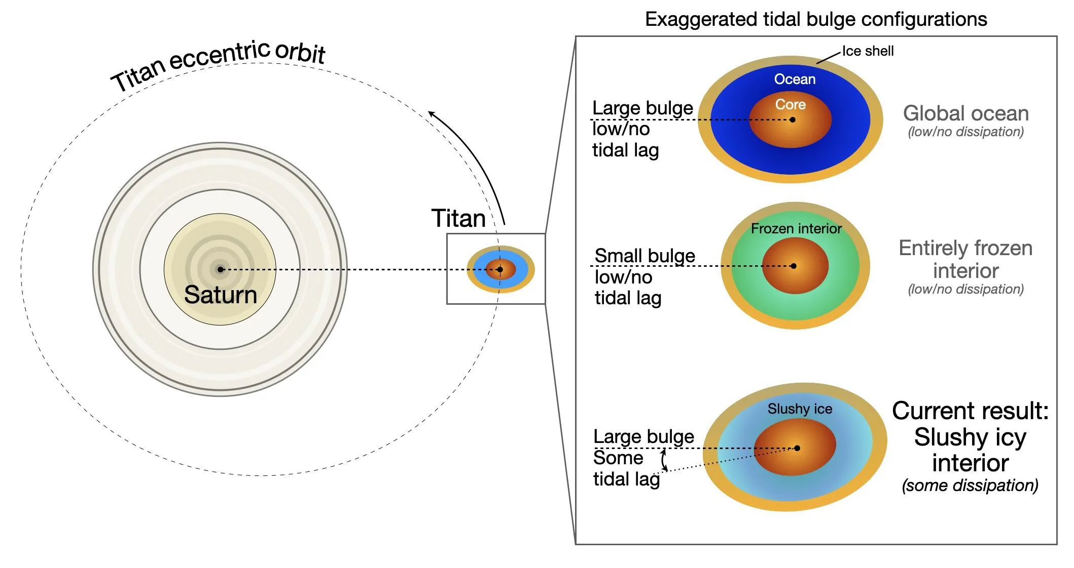 Vaziyatga oydinlik kiritish uchun italiyalik va amerikalik astronomlar «Kassini»ning 2004-yildan 2017-yilgacha davrdagi barcha ma’lumotlarini tahlil qilishdi va Titanning Saturn atrofidagi trayektoriyasini rekonstruksiya qilishdi. Asosiy kashfiyot Saturnning tortishish kuchi ta’sirida Titan deformatsiyasining kechikish bilan namoyon bo‘lishi bo‘ldi. Ya’ni yo‘ldosh shaklini taxminan 15 soat kechikib o‘zgartiradi, bu uning ichki tuzilishi suyuq emas, balki yopishqoq ekanini ko‘rsatadi — bu fakt ilgari hisobga olinmagan. Hisob-kitoblar shuni ko‘rsatdiki, Titan qa’ri ilgari taxmin qilinganidan ko‘ra ko‘proq energiya tarqatadi va kamroq deformatsiyaga uchraydi.