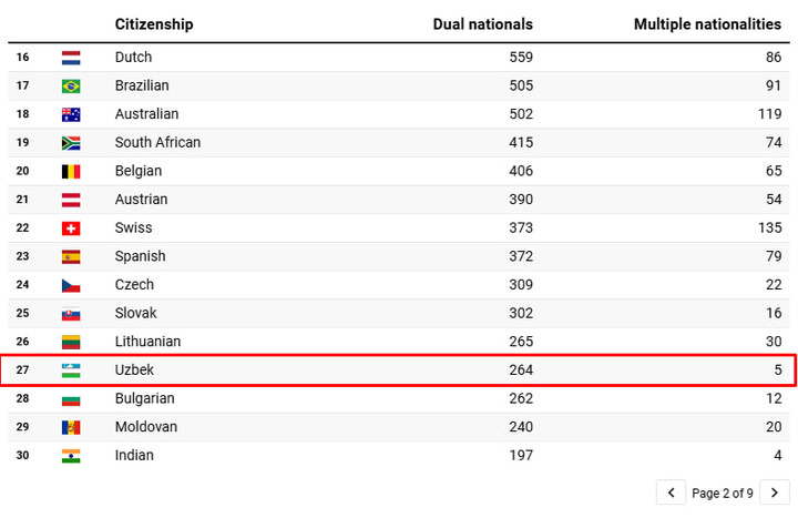 - Qozog‘iston – 189 nafar (ikki fuqarolik), 3 nafar (ko‘p fuqarolik);