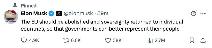 «Yevropa Ittifoqini yo‘q qilish va alohida mamlakatlarga suverenitetini qaytarish kerak, shunda hukumatlar o‘z xalqlarini yaxshiroq ifodalay oladi», deb yozdi u X ijtimoiy tarmog‘ida.