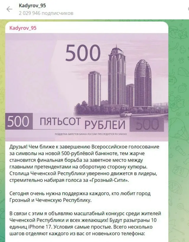 Чеченистон раҳбари Рамзан Қодиров ўз телеграм-каналида танлов эълон қилди. У янги купюрада «Грозний-Сити»га овоз берганларга 10 та iPhone 17 ваъда қилган.
